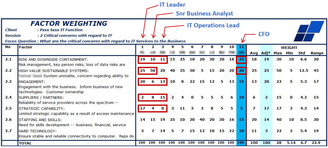 Here are the Critical Factor weightings from a client workshop evidencing misalignment between personnel. A serious conflict was subsequently resolved.